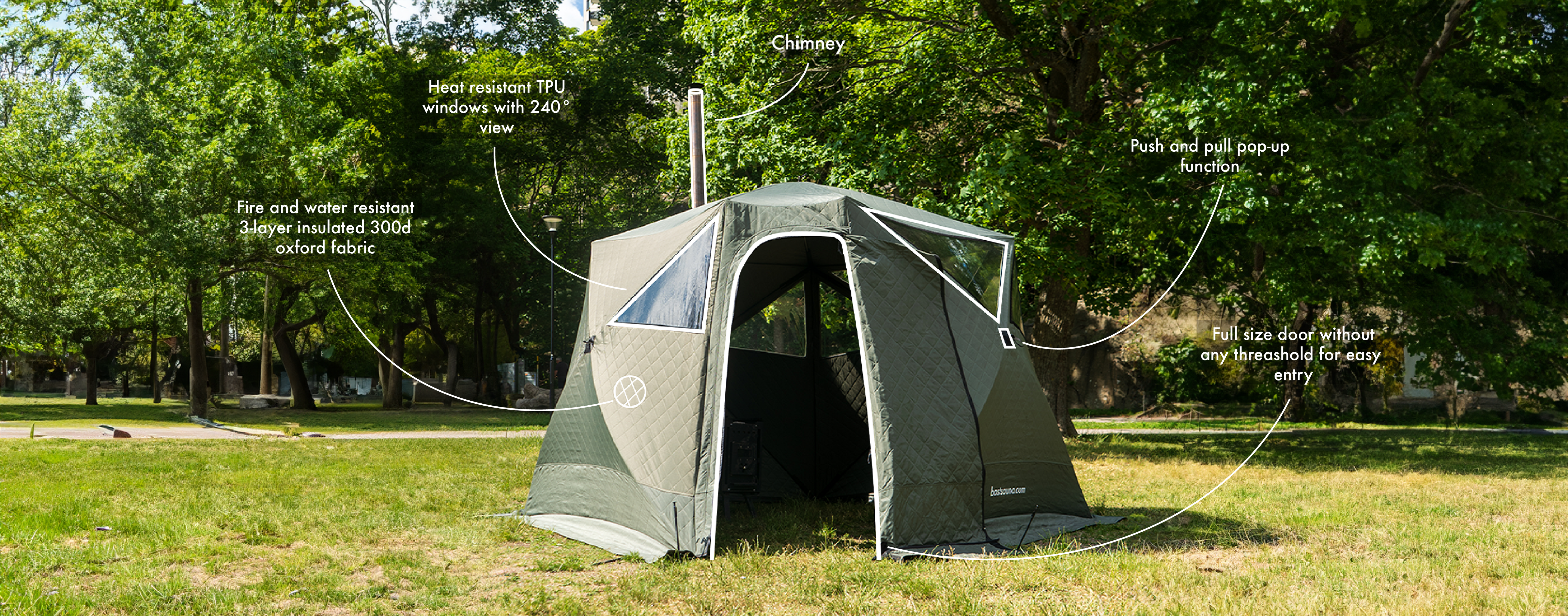Das Zelt besteht aus dem langlebigsten und isolierendsten Stoff auf dem Markt. Es hält temperaturen von bis zu -35 Grad stand.