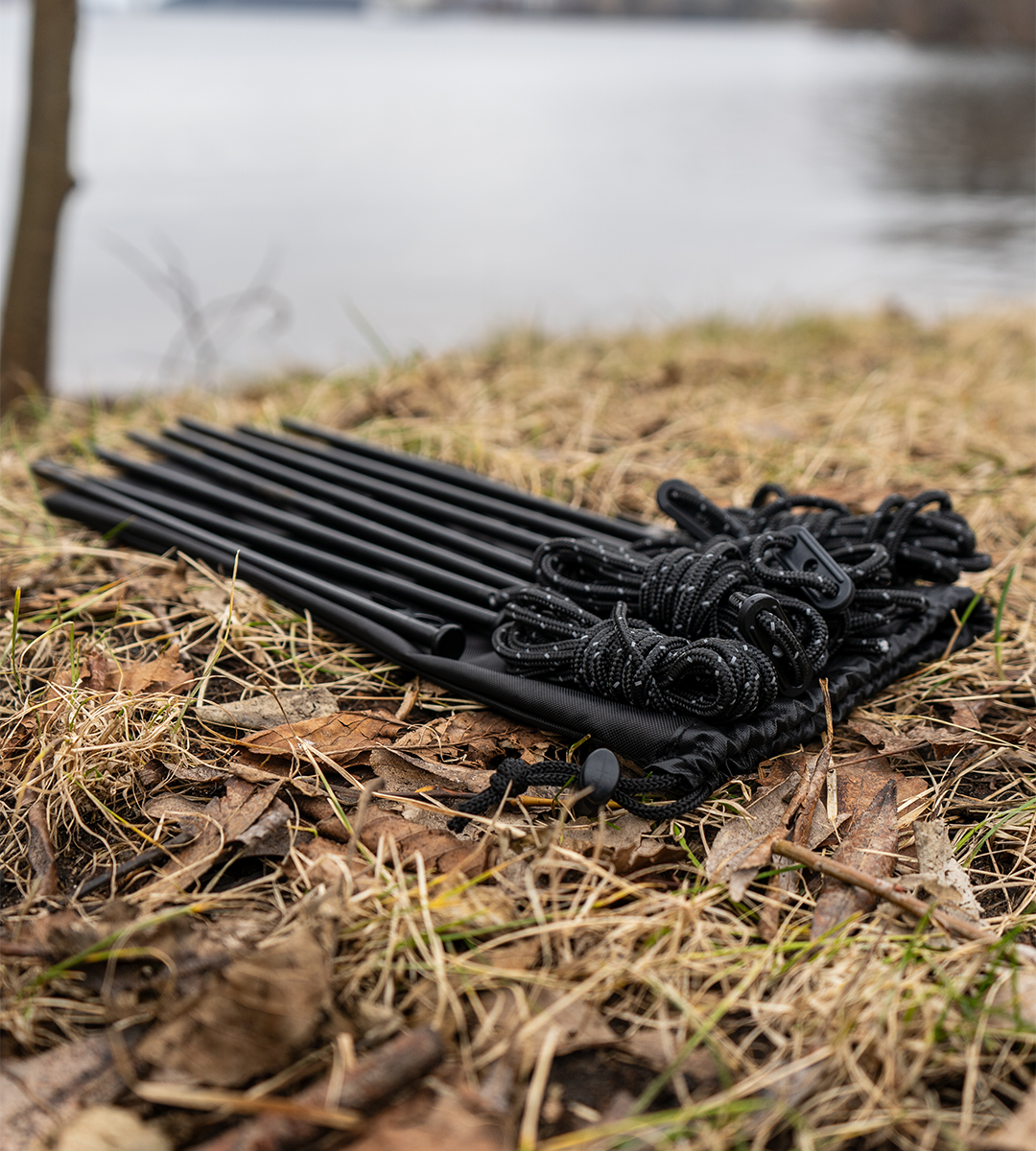 Das Pop-Up Zelt kann in weniger als zwei Minuten aufgebaut werden. Sobald das Zelt steht, wird es mit Heringen und Sturmleinen gesichert. Dann bringst du den Ofen hinein und montierst die Schornsteinteile. Wenn der Ofen stabil steht, kannst du das Feuer entzünden. Insgesamt solltest du etwa 15 Minuten einplanen, um die Sauna vollständig aufzubauen und zu starten.