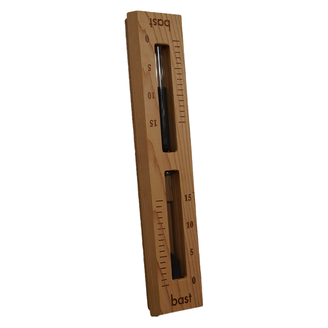 Denne unike timeglasset måler 15 minutter – perfekt for et klassisk badstuebad. Med sitt stilrene design blir det både en praktisk og dekorativ detalj i badstuen.